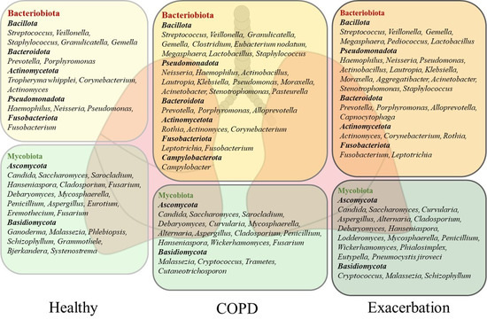 The composition of the lung microbiota in healthy subjects and patients with chronic obstructive pulmonary disease (COPD). The microbiota of healthy and COPD lungs is dominated by the bacterial phyla Bacteroidota, Bacillota, Pseudomonadota, Fusobacteriota, and Actinomycetota and the fungal phyla Ascomycota and Basidiomycota. The most commonly detected bacterial and fungal genera in sputum and bronchoalveolar lavage fluid (BALF) from healthy subjects and COPD patients are presented. The stable state of COPD is dominated by Bacillota and Bacteroidota, while Pseudomonadota and Actinomycetota increase in severe disease and during exacerbation. The fungal genera Candida, Aspergillus, and Penicillium feature healthy lungs, but their pathogenic effects characterize severe COPD and exacerbation. The increase in pathogens in severe COPD and exacerbation is followed by a decrease in beneficial commensals.