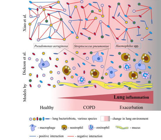 Although significant progress has been recently made in the research on the lung microbiota, whether lung dysbiosis can cause the occurrence and progression of COPD or the microbiota simply mirrors the pathogenesis of COPD is not clear yet. Within the model suggested by Dickson et al., lung dysbiosis and inflammation follow each other and worsen with the progression of COPD and exacerbation. According to this model, we do not know whether a change in the lung microbiota can cause COPD. However, in the model that arose from the study by Xiao et al., the focus shifted to the positive and negative interactions which are related to bacterial cooperation and competition, respectively. This model offers better insight into the process of COPD dysbiosis, which is characterized by an imbalance between bacterial cooperation and competition, leading to the destabilization of the lung microbiota. Interestingly, following this model, the dominance of Haemophilus spp. is reflected in an increase in antagonistic interactions in COPD. However, if common pneumonia could cause COPD, the lung microbiota may be a driving factor of COPD.