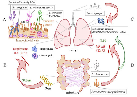 Selected effects of probiotics in COPD. (A) Lactobacillus acidophilus prevents the adhesion of P. aeruginosa to lung epithelial cells. L. brevis BGZLS10-17 and L. plantarum BGPKM22 attenuate the LPS–induced expression of the interleukin (IL) 8 and monocyte chemoattractant protein (MCP) 1 genes and the activation of nuclear factor–κB (NF–κB) and mitogen–activated protein kinases (MAPKs) in the bronchial epithelial cells. Heat–killed BGPKM22 possesses antioxidant activity and inhibits the cigarette smoke–induced expression of the aryl hydrocarbon receptor (AHR) and nuclear factor erythroid 2 related factor 2 (NRF2) genes. (B) A high–fibre diet, via stimulation of the production of short–chain fatty acids (SCFAs), leeds to a decrease in macrophages, lymphocytes, IL6, and IFNγ in the BALF and preventes the progression of emphysema in a mouse model. (C) Bacteriophage therapy efficiently eliminates a carbapenem–resistant Acinetobacter baumannii (CRAB) from the lung of a COPD patient. (D) Via the lung–gut axis, L. rhamnosus reduces the expression of NF–κB and signal transducer and activator of transcription (STAT) 3 and increases the levels of IL10 in the lungs. An intestinal commensal Parabacteroides goldsteinii inhibits NF–κB activation in the lungs by acting through the gut–lung axis.
