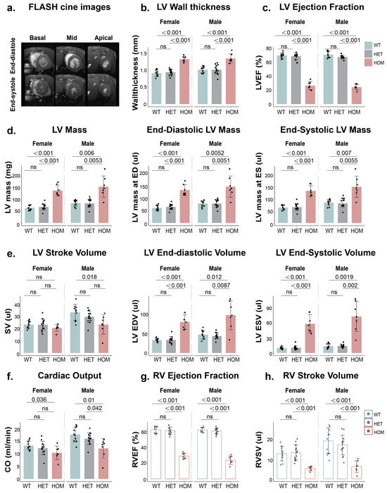 Assessing ventricular function and structure is crucial for understanding the early pathological changes in HCM. Our analysis revealed distinct differences among the HCM genotypes for LV and RV ejection fraction (LVEF and RVEF, respectively), LV end-diastolic volume (LVEDV), LV end-systolic volume (LVESV), cardiac output (CO), LV stroke volume (LVSV), RV stroke volume (RVSV), LV mass, LV end-diastolic mass (LV mass at ED), and LV end-systolic mass (LV mass at ES). HET mice carrying one mutated allele have LV and RV functions that did not differ to the WT mice. On the other hand, HOM mice that are bi-allelic for the genetic defects exhibited significantly lower LV and RV functions (Figure 1c–h). These trends were consistent across male and female mice. In males, LVEF did not differ significantly between HET and WT mice, while it was 66% lower in HOM mice than in WT mice (p < 0.001). In females, LVEF values were similar between HET and WT mice, while they were 60% lower in HOM than in WT mice (p < 0.001; Figure 1c). Similarly, RVEF did not differ between male HET and WT mice, whereas it was 62% lower in HOM than in WT male mice (p < 0.001). Similarly, RVEF did not differ between HET and WT female mice, whereas it was 54% lower in HOM than in WT female mice (p < 0.001; Figure 1g). Additionally, left ventricular wall thickness was significantly greater in HOM mice than in both WT and HET mice. LV wall thickness in HOM mice was markedly greater than in the WT group (male: p < 0.001, female: p < 0.001; Figure 1b). These findings underscore the significant functional and structural differences between WT and HOM mice, with HET mice exhibiting normal values.
