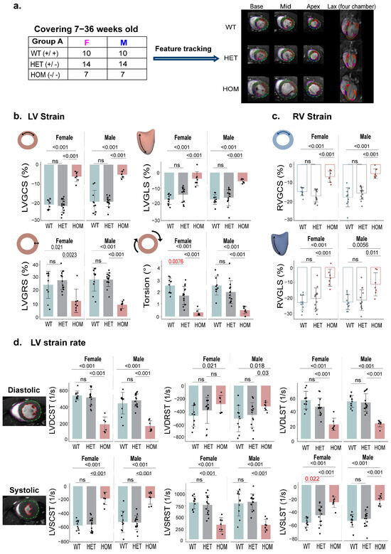 To evaluate bi-ventricular myocardial deformation in HCM mouse models, we successfully utilized CMR-FT for comprehensive analysis. The tracking quality for both endocardial and epicardial borders was deemed adequate through visual inspection and manual adjustments. The age of the WT female group (n = 10) was 15.6 ± 11.5 weeks and for the WT male group (n = 10) 15.7 ± 11.2 weeks. The age of HET female group (n = 14) was 15.2 ± 10 weeks, while it was 19 ± 10.5 weeks for the HET male group (n = 14). The age of the HOM female group (n = 7) was 18.6 ± 11.1 weeks, and that of the HOM male group (n = 7) was 13 ± 8.5 weeks (Figure 2a).