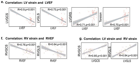 We observed strong correlations between LV strain metrics (LVGCS, LVGRS, LVGLS, torsion) and LVEF (R ≥ 0.7, p < 0.001; Figure 2e), as well as between RV strain metrics (RVGCS (R = 0.78), RVGLS (R = 0.64)) and RVEF (p < 0.001; Figure 2f). Although strain demonstrated a strong correlation with EF, it offered superior sensitivity in detecting subclinical myocardial dysfunction. While no significant differences were observed in the LV and RV functional parameters between the WT and HET groups (Figure 1), the strain parameters revealed distinct differences, highlighting their ability to detect subtle myocardial changes. Positive correlations were also found between LV and RV global strains, with RVGCS and LVGCS (R = 0.85, p < 0.001) and RVGLS and LVGLS (R = 0.84, p < 0.001; Figure 2g).