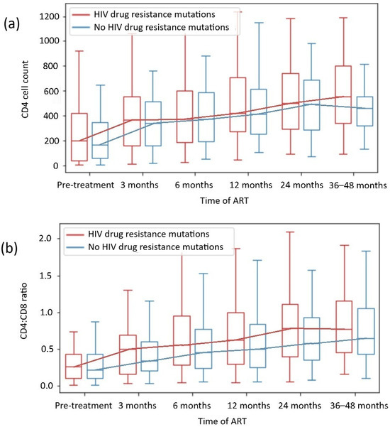 Outcomes are related to subtype differences and resistance mutations, highlighting the importance of analyzing the features of HIV subtypes in the occurrence of DRMs, particularly when drug-resistant strains emerge [31,32,33]. Because the reasons for failed immune reconstitution remain unclear, we analyzed whether viral features, such as HIV subtype and the presence of primary DRMs, are associated with the reconstitution of CD4 cells during effective ART.