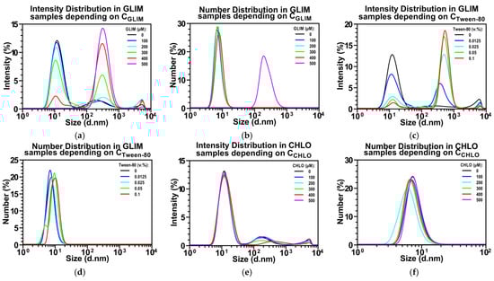 Effect of drug concentrations and Tween-80 on particle size distribution. Experiments were conducted in PBS (pH 7.4) at 37 °C, with 0.5% DMSO and 4.5 mg/mL BSA. This study examined 100–500 µM GLIM without Tween-80 (a,b); 300 µM GLIM with 0.0125–0.1% Tween-80 (c,d); and 100–500 µM CHLO with 0.05% Tween-80 (e,f). Size distribution histograms for GLIM samples in PBS alone and with 0.05% Tween-80, along with detailed DLS results, are provided in the Supplementary Materials (Figures S3–S5). Concentrations reported are expected concentrations (Cexp), based on the total drug added. This preliminary experiment was conducted once (n = 1) to evaluate feasibility; additional replicates are needed to confirm findings and ensure reproducibility.