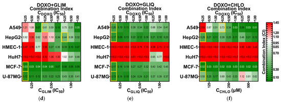 In the second phase of our cytotoxicity synergy assessment, we used the same approach as in the initial study but administered lower doses of the drugs, corresponding to fractions of their IC50 values. The results of MTT assays on a panel of cell lines (Figure 5a–c) showed a predominant dose-dependent decrease in cell viability with increasing concentrations of both drugs. Combined treatment typically resulted in a synergistic increase in cytotoxicity compared to DOXO monotherapy (Figure S13), as indicated by low CI values on synergy heat maps (Figure 5d–f). Based on these values, we identified cells (highlighted in yellow) that represent the most effective combination treatments. These combinations correspond to the lowest doses of drugs that show synergistic cytotoxicity in their respective cell lines. Among these, the MCF-7 cell line showed exceptional sensitivity to the DOXO + GLIM combination. Specifically, administration of ¼ IC50 DOXO (0.12 µM) and ¼ IC50 GLIM (45.1 µM) resulted in a 4.4-fold improvement in cytotoxicity, reducing MCF-7 cell viability to 16.0% compared to 70.2% for DOXO alone (Figure S13).
