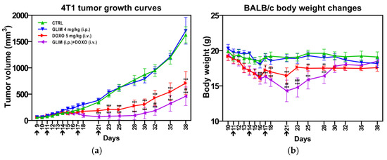 Therapeutic efficacy of DOXO alone and in combination with GLIM against 4T1 breast cancer in vivo. Tumor growth curves (a) and body weight changes (b) in BALB/c mice bearing 4T1 tumors. Beginning nine days after tumor inoculation, mice with well-developed tumors were treated with either monotherapies or combination therapy. GLIM was administered intraperitoneally (i.p.) at 4 mg/kg, and DOXO was administered intravenously (i.v.) at 5 mg/kg. Both treatments were given simultaneously on days 9, 11, 14, 17, and 21, as indicated by the arrows in the figure. Tumor volume and body weight were measured daily for the first 8 days and then three times per week. Data are presented as mean ± SD (n = 5–6). *, p < 0.05 vs. CTRL; **, p < 0.01 vs. CTRL; ***, p < 0.001 vs. CTRL; #, p < 0.05 vs. DOXO; ##, p < 0.01 vs. DOXO 5 mg/kg (i.v.); ###, p < 0.001 vs. DOXO 5 mg/kg (i.v.).