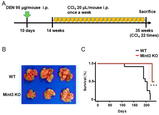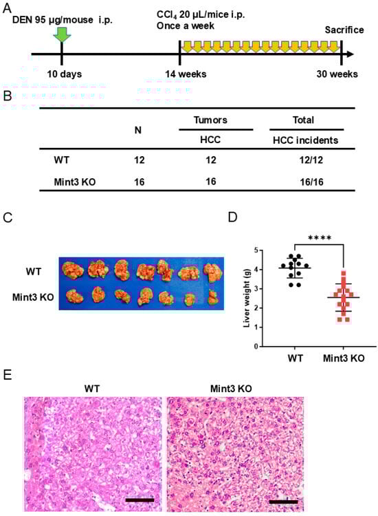 2.3. Chemical HCC Development Initiated and Promoted by DEN/CCl4 Is Impaired in Mint3 KO Mice