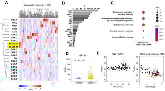 Comparison of the coagulome of primary vs. metastastic SKCM. (A) Hierarchical clustering based on the normalized expression levels of 138 CRGs. Primary SKCM tumors (SKCM_P) and metastases (SKCM_M), highlighted in yellow, and 19 other types of primary tumors from TCGA were analyzed. (B) The top 20 CRGs with higher variance in primary vs. metastatic SKCM (Fisher F test). (C) GO term analysis (GO Biological Process complete) of CRGs with at least a 2-fold higher expression in SKCM_M vs. SKCM_P (n = 16, p < 0.05, Student t test, FDR). (D) Violin plots showing the expression of GP1BA, the most differentially expressed gene, between SKCM_P and SKCM_M. (E) Plots showing the relationship between the expression of CRGs (RSEM) and their correlation with the copy number (CNA) or methylation levels (Pearson R). Points shown in red have an absolute Pearson correlation coefficient greater than 0.5. Points shown in black have an absolute Pearson r less than 0.5.