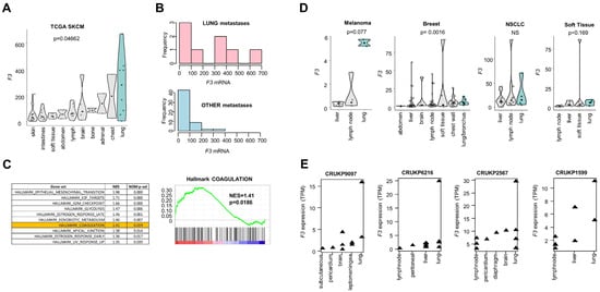 Lung metastases of SKCM express higher F3 levels. (A) F3 expression analysis in different metastatic locations of SKCM from TCGA, p < 0.05 with Kruskal–Wallis test. Lung metastases are shown in turquoise, other metastatic sites in grey. (B) Distribution of F3 expression in SKCM lung metastases (n = 8, pink) compared to other locations (n = 63, blue). (C) GSEA showing a significant enrichment in the hallmark “Coagulation” in lung metastases of SKCM compared to other metastatic sites. (D) F3 expression analysis in metastastic samples from four types of tumors from the BCSGC cohort (n = 438). Note that F3 levels are presented for metastastic locations with >2 samples. (E) F3 expression in multiple matched samples from 4 patients with SKCM (PEACE study).