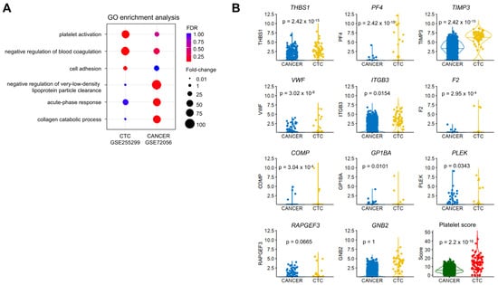 The coagulome of circulating tumor cells (CTCs) from SKCM. (A) GO term enrichment analysis of CTCs (GSE255299) compared to cancer cells from GSE72056, using the most significantly differentially expressed genes, between the two groups. (B) Violin plots showing the most differentially expressed platelet-related genes between CTCs and cancer cells. The overall “Platelet score” is obtained from the combination of the corresponding 11 platelet genes.