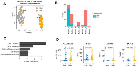 Importantly, the distribution of CTCs into two clusters overlapped with the platelet signature defined earlier (Figure 5A). An individual patient analysis showed that the proportion of CTCs expressing platelet genes varied from 17.2% to 100% according to the patient (Figure 5B). Finally, we addressed the functional state of CTCs with a high platelet signature: a GO term analysis applied to the list of genes whose expression levels positively correlated with the platelet signature identified “MYC TARGETS v1” as highly enriched (p = 9.88 × 10−8) (Table S8, Figure 5C). Interestingly, four genes known to be related to cancer cell stemness in malignant melanoma (ALDH1A3, BSG, NGFR, SOX2) [] were expressed at significantly high levels in CTCs with a high “platelet signature” (p = 0.0204, 0.0012, 0.0183, 0.0200, respectively).