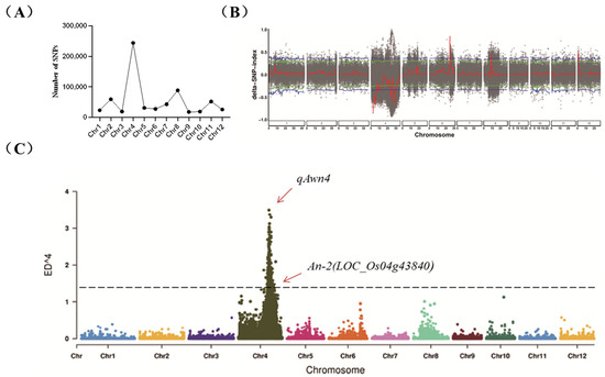 Sequencing data were filtered to obtain a total of 646,740 high-quality SNPs, primarily enriched on chromosome 4 (Figure 2A). Further analysis of the SNP index and ED results confirmed the presence of a major QTL on chromosome 4, peaking between 23.55 Mb and 26.38 Mb (Figure 2B,C), tentatively named qAwn4. The SNP indices between the long-awn mixed pools and the short-awn mixed pools was 0.95 and 0.1, respectively (Table 1). Blast analysis was conducted on the candidate genes within the qAwn4 interval individually. This analysis identified the gene LOC_Os04g43840, which is most likely responsible for the long-awn phenotype observed in the long-awn parent CSSL29. Gene functional annotation analysis revealed the presence of the gene An-2, which positively regulates rice grain awn length and encodes a cytokinin-activating enzyme [15]. In addition, analysis using QTL mapping from the previous resequencing of a CSSL population of 9311 NIP revealed that the chromosomal substitution segment containing An-2 contained another gene related to awn development, LOC_Os04g28280(An-1), which is a transcription factor [16].