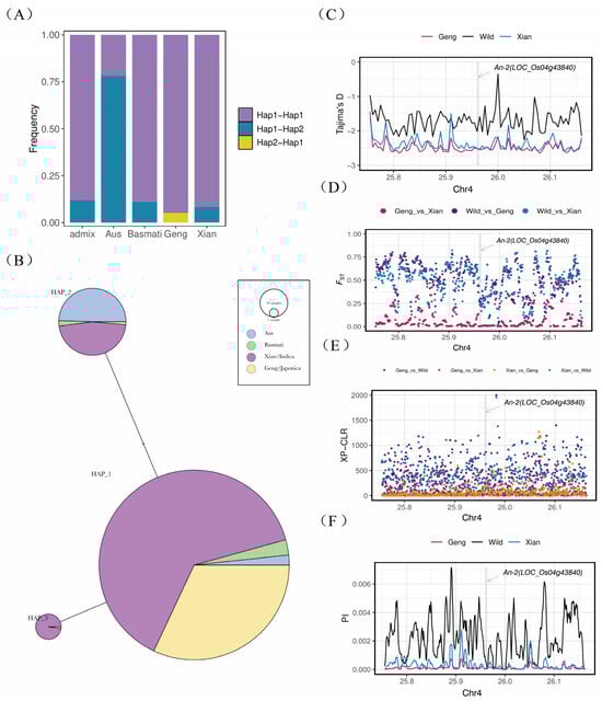 Haplotypes and population genetic analysis. (A) Promoter–CDS haplotype frequency distribution plot. (B) Haplotype network. (C) Fst: index of genetic differentiation between populations. (D) Tajima’s D: neutrality test. (E) PI: population nucleotide diversity analysis. (F) XP-CLR: cross-population composite likelihood ratio test.