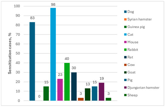 Polysensitization to other animals was very often observed among people allergic to horses. The percentage of sensitization to other animals was determined as follows: sensitization to cats—95%; sensitization to dogs—82%; sensitization to mice—40%; and sensitization to cows—31% in the group of 99 individuals allergic to horses by using ImmunoCAP ISAC tests (Figure 4). A similar profile of co-allergy was observed in case of using the Allergy Xplorer ALEX, where the percentage of sensitization to other animals was determined as follows: sensitization to cats—98%; sensitization to dogs—83%; sensitization to rabbits (40%); and sensitization to rats (30%) in the group of 40 individuals allergic to horses (Figure 5).