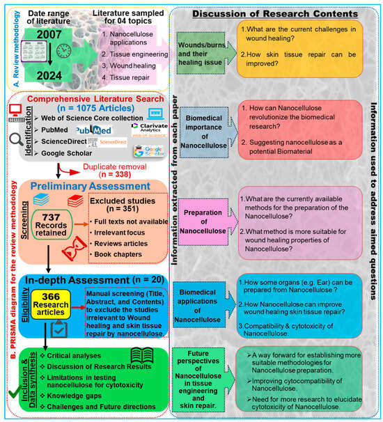 Overview of the review methodology: A. Outline of the literature review design, article collection process, and formulation of research questions. B. Flowchart illustrating the PRISMA approach, detailing the acceptance and rejection criteria for publications. Based on the relevant inquiries, goals, and objectives, a total of 366 articles were identified as eligible from an initial pool of 1075 articles.