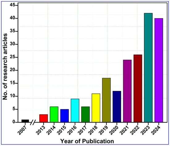Year-wise publication records on the topic, “Tissue engineering and wound-healing properties of nanocellulose”. The related data were retrieved from the Web of Science, PubMed, ScienceDirect, and Google Scholar databases published up to 31 December 2024 by searching key phrases, such as “nanocellulose” and “wound healing” and “tissue engineering” and “skin tissue repair” in the title/abstract/author keywords of the reported research.