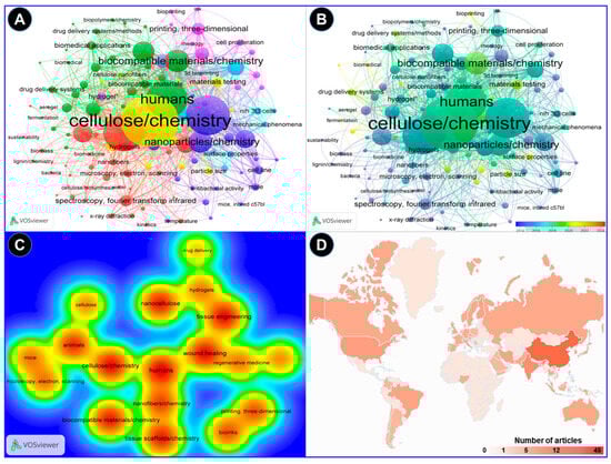 A bibliometric analysis of the reported research on applications of nanocellulose for wound healing and tissue engineering. The analysis was performed in the VOSviewer software. (A) A keyword co-occurrence network analysis indicating the correlation of the nanocellulose with possible biomedical applications in humans. (B) The overlay visualization depicted the change in the scientific focus in recent years toward the wound repair mechanisms of nanocellulose dressing. (C) The density visualization of nanocellulose research analyzed by the full counting method suggests close links of nanocellulose with tissue engineering and wound healing. (D) Country-wise distribution of the research on the topic based on the number of research articles published.