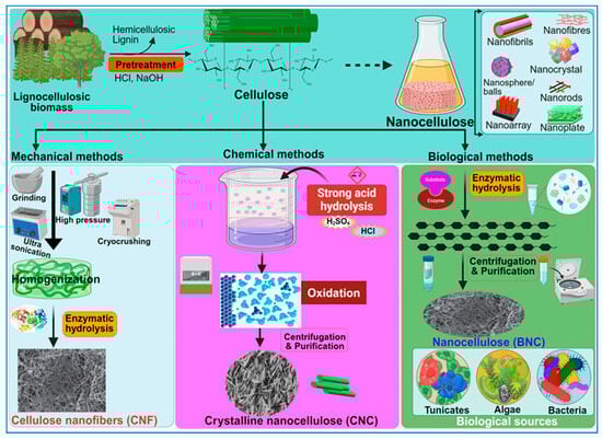 Nanocellulose is the tiniest form of cellulose, having nanostructures measuring less than 100 nm in size in one dimension []. In certain cases, they can be hundreds of nanometers or micrometers in size, especially with electrospun nanofibers (Table 1). Based on the shape and structural dynamics, the cellulose nanostructures may be classified as nanofibrils, nanofibers, nanowhiskers, nanocrystals, nanorods, and nanoballs. Nanofibrils are commonly observed as hydrogels [] and can originate from bacterial secretion or undergo extraction from woody plants through mechanisms such as hydrolysis, oxidation, and mechanical disintegration []. Similarly, nanofibers are exceedingly thin, fibrous cellulosic structures with properties akin to nanofibrils, often isolated from sources like pineapple []. Nanofibers, although slightly thicker and longer than nanofibrils, are typically produced via electrospinning of cellulose blended with other synthetic polymers or composites []. Despite having diameters exceeding 100 nm, electrospun nanofibers are commonly referred to as “nanofibers” []. Cellulose nanowhiskers, nanocrystals, and nanorods, on the other hand, exhibit fibrous morphologies with diameters comparable to nanofibrils but are characterized by shorter lengths. Nanocrystals may assume needle-like or rod-shaped morphologies [], while nanorods are specifically rod-shaped nanocrystals []. The terms “cellulose nanowhiskers”, “cellulose nanocrystals”, and “cellulose nanorods” are often used interchangeably in the scientific literature []. The nanostructures are derived through the selective breakdown of the amorphous regions within cellulose molecules, achieved primarily via acid hydrolysis while preserving the crystalline components (Figure 4). Figure 4 illustrates various methods, key stages, and the main technologies employed in the synthesis of nanocellulose. Consequently, the resultant CNC, nanowhiskers, and nanorods exhibit heightened crystallinity indices compared with cellulose nanofibrils. The latter are typically generated via enzymatic hydrolysis [] or mechanical processes such as grinding and shearing [], leading to the removal of non-crystalline regions. Moreover, cellulose nanoballs, or nanocrystalline cellulose particles with a spherical morphology, are documented entities []. In contrast, nanoplatelets represent plate-like structures composed of nanofibrils with thicknesses on the nanoscale, often extending to micrometer dimensions in other axes [].