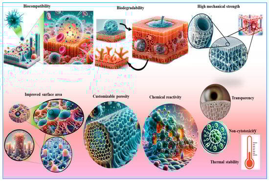 An illustration of the unique properties of nanocellulose that make it suitable for various biomedical applications, including tissue engineering, wound healing, and skin tissue repair. Key attributes include biocompatibility, high surface area, mechanical strength, and the ability to promote cell adhesion and proliferation.