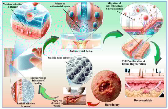 Skin represents a remarkably complex and multifunctional organ that serves as the primary interface between an organism and its external environment. Its complex architecture, comprising a stratified epithelium (epidermis) and an underlying connective tissue layer (dermis), confers a multitude of vital physiological roles. Firstly, the skin acts as an exquisitely structured physicochemical barrier, protecting against a myriad of environmental effects, including microbial pathogens, noxious chemical agents, and deleterious electromagnetic radiation, particularly in the ultraviolet spectrum. Additionally, it safeguards thermoregulation and against mechanical trauma and minimizes transepidermal water loss, thereby maintaining hydroelectrolytic homeostasis, in addition to secreting some vital compounds that include pigmentary compounds, vitamin D precursors, and structural proteins like keratins, which are instrumental in the formation and maintenance of epidermal appendages such as hair and nails []. Therefore, it is critical to regenerate or at the very least repair injured skin, notably through skin tissue engineering and wound healing processes. Nanocellulose provides various advantages for these applications, including adequate mechanical strength and high water-absorption capacity, which allow it to preserve moisture in injured skin while absorbing the exudate from wounds []. The nanoscale morphology of nanocellulose mimics the architecture of the native extracellular matrix, making it a suitable substrate for skin cell adhesion and growth (Figure 8). Many in vivo studies have confirmed the healing of skin defects in mice by BNC-based wound dressings []. Table 4 highlights the diverse potential of nanocellulose-based composites in wound healing and skin tissue repair.