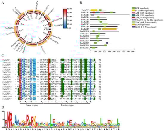 Chromosomal locations and conserved domain distributions of 17 FocbZIP family members in Foc TR4. (A) Chromosomal locations of FocbZIP genes (outer circle) and the gene densities of the chromosomes (inner circle). The color scale represents variations in gene densities, with red signifying an increase and blue indicating a decrease. (B) Conserved domains of FocbZIP proteins highlighted in different colors. (C) Multiple sequence alignment of the bZIP domain in 17 FocbZIP proteins in Foc TR4. Red, blue, and green indicate the conserved percentage of 100%, >80%, and >60%, respectively. The short, black lines at the bottom represent a typical bZIP domain. (D) The sequence logo formed by the bZIP domain from the 17 FocbZIP proteins, and the larger letters of the amino acid residues, the more frequently they appear at the same site.