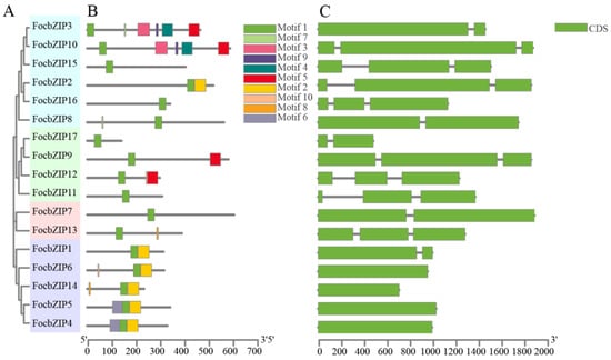 The distribution of the 17 FocbZIP genes across the chromosomes is shown in Figure 1A. These genes were spread across 10 chromosomes: Chromosome 4 (Chr4), Chr5, Chr12, Chr13, and Chr14 each contained one FocbZIP gene; Chr3, Chr7, Chr9, and Chr15 each contained two FocbZIPs; and Chr6 contained four FocbZIPs. Although the FocbZIP genes were not evenly distributed, no chromosome showed a preferential accumulation of these genes.