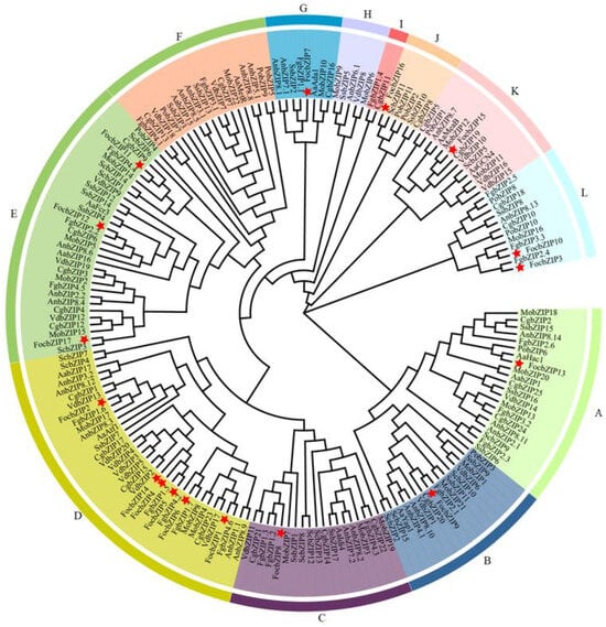 Phylogenetic analysis of bZIP proteins in 10 fungal species. Proteins were clustered into 12 clades (A–L) indicated by different colored lines, FocbZIP proteins are marked with red stars. Aa: Alternaria alternate; An: Aspergillus nidulans; Cg: Colletotrichum gloeosporioides; Foc: Fusarium oxysporum f. sp. cubense tropical race 4; Fg: Fusarium graminearum; Mo: Magnaporthe oryzae; Po: Pleurotus ostreatus; Sc: Saccharomyces cerevisiae; Ss: Sclerotinia sclerotiorum; Vd: Verticillium dahliae.