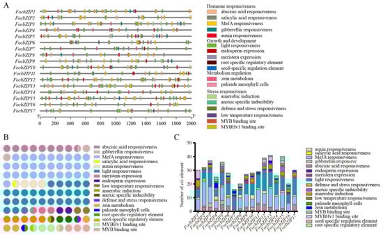 cis-element analysis in FocbZIP promoters of Foc TR4. (A) Distribution of different types of cis-elements in FocbZIPs. (B) Number of cis-elements related to a specific function. Different functions are represented in different colors and the number of circles indicate the number of functions. (C) Number of cis-elements contained in each FocbZIP promoter. Different functions are represented in different colors.