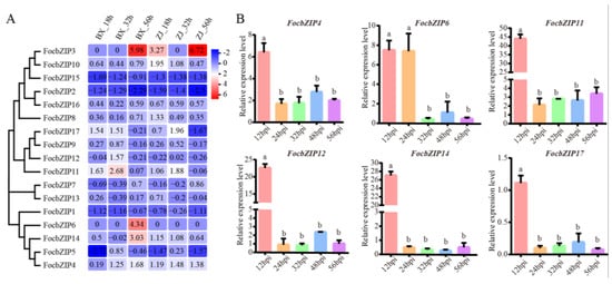 Expression profiles and RT-qPCR gene expression patterns of FocbZIPs at early infection stages. (A) Heatmap showing the expression data for each FocbZIP. Original FPKM values of FocbZIP genes were transformed by log2. Red indicates up-regulation and blue indicates down-regulation. (B) Expression of six FocbZIP genes at different points during early infection processes by Foc TR4 in banana roots. Fungal reference gene FocEF1α (elongation factor 1-alpha) was used to normalize expression levels. Vertical bars represent means ± SD (n = 3). Different letters above the columns indicate the significant differences (via one-way analysis of variance, p < 0.05).