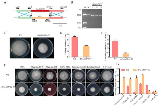 Phenotypic analyses and sensitivity tests of the ΔFocbZIP11-T1 mutant. (A) Schematic diagram of the FocbZIP11 gene deletion process and primers used to verify the gene replacement event. (B) Confirmation of the ΔFocbZIP11-T1 mutant via PCR amplification. M: 2000 bp marker. A 1790 bp fragment from the ΔFocbZIP11-T1 mutant containing a partial upstream sequence and downstream sequence of the FocbZIP11 and HPH gene sequences was amplified by the primer pair I-F/I-R. This confirmed that the 1421 bp fragment of the FocbZIP11 gene was replaced by the 1349 bp fragment of the HPH gene. (C) Colony morphology of the WT and ΔFocbZIP11-T1 strains after growth on PDA plates for 6 days. (D) Colony diameter of WT and ΔFocbZIP11-T1 after growth for 6 days. (E) Conidia production of the WT and ΔFocbZIP11-T1 mutants. (F) Morphology of the WT and ΔFocbZIP11-T1 mutants on PDA plates with abiotic stresses (100 μg/mL CFW, 100 μg/mL CR and 0.02% SDS, 2 mol/L sorbitol, 1 mol/L NaCl, 0.1% H2O2) 6 days after inoculation. (G) Quantification of colony size inhibition in each strain. The inhibition rate is calculated as the percentage growth reduction in the treated samples compared to the control. Vertical bars represent means ± SD (n = 3). Asterisks indicate significant differences (p < 0.05).