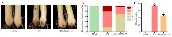 We selected banana plantlets at the five- to six-leaf stage for pathogenicity testing, following the method described previously []. Conidia from the WT and ΔFocbZIP11-T1 mutant strains were collected after 5 days of culturing in PDB. The conidial suspension was adjusted to 1 × 107 conidia/mL for banana root inoculation by irrigation. We soaked the banana plantlet roots in the suspension for 30 min, replanted the plantlets in pots, and placed them in a greenhouse at 28 °C. The experiment was repeated three times, with 30 plantlets per treatment. We evaluated disease symptoms 40 days after inoculation. The disease index was scored as follows: 0 (no symptoms), 1 (some brown spots on the inner rhizome), 2 (browning of less than 1/4 of the inner rhizome), 3 (browning of up to 3/4 of the inner rhizome), and 4 (dark brown and death of the entire inner rhizome and pseudostem).