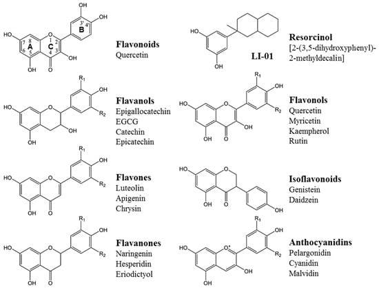 Dietary polyphenols, which are ubiquitously present in fruits, vegetables, seeds, and drinks, have received much recent attention for their health benefits [,,]. More than 8000 different types of polyphenols have been identified so far and divided into ten different classes based on their chemical structure [,,]. The most abundantly occurring polyphenols in plants include flavonoids, phenolic acids, stilbenes, and lignans. The flavonoids are the most studied group of plant polyphenols and account for 60% of ~4000 dietary polyphenols [,,]. As shown in Figure 1, flavonoids are structurally characterized by two benzene rings joined by a pyran ring, or a similar structure of three rings, which are referred to as A, B, and C, respectively [].