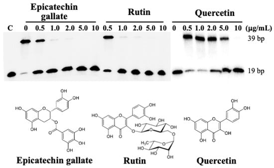 As shown in Figure 3, representative flavonoids, including epigallocatechin, quercetin, and rutin, turned out to be potent inhibitors of human DNA ligase I based on our biochemical assay, with IC50 values of 0.5, 0.5, and 3.0 μg/mL, respectively (see also a plot in Supplementary Figure S2).
