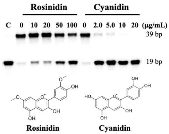 Cyanidin, a flavonoid with free hydroxyl groups on its resorcinol and catechol rings, is a type of anthocyanidin found in many red fruits and vegetables [,,,]. Rosinidin is an anthocyanidin cation consisting of benzopyrylium with hydroxy substituents at positions 3 and 5, a methoxy group at position 7, and a 4-hydroxy-3-methoxyphenyl group at position 2 []. As shown in Figure 4, cyanidin also showed potent inhibitory activity against human DNA ligase I at an IC50 value of about 1.0 µg/mL (see also plots in Supplementary Figure S3). However, rosinidin showed little activity against human DNA ligase I, suggesting that unsubstituted hydroxyl groups on the resorcinol ring are required to mediate inhibitory activity.