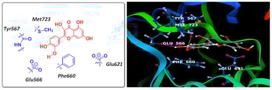 Docking model of quercetin with human DNA ligase I adenylation domain (right panel) and schematic representation (left panel).