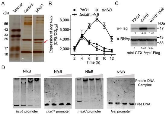 H1-T6SS is an important secretion apparatus in P. aeruginosa, and it is involved in bacterial competition and pathogenesis [,]. To further investigate the regulatory mechanisms of H1-T6SS, a DNA pull-down assay was carried out with streptavidin-coupled magnetic beads and the key promoter of the H1-T6SS gene cluster. After affinity chromatography of P. aeruginosa cell lysate using hcp1 promoter DNA, a significant protein band was observed in the SDS-PAGE gel (Figure 1A). Based on mass spectrometry, the protein was identified as NfxB (Figure S1), a TetR/AcrR family transcriptional regulator for the mexCD-oprJ operon and fluoroquinolone antibiotic resistance [,]. To verify the regulatory relationship of NfxB and H1-T6SS, an in-frame deletion mutant strain ΔnfxB was constructed. Then, hcp1-promoter-driven luxCDABE reporter plasmid pKD-hcp1 was transformed into wild-type PAO1 and the ΔnfxB mutant. As shown in Figure 1B, the luminescence intensity of the hcp1 promoter–reporter fusion in the ΔnfxB mutant strain was significantly higher than that in the wild-type PAO1 strain, and the luminescence intensity could be restored to the wild-type level through nfxB complementation (Figure 1B). This regulation was also confirmed by monitoring the protein production levels of Hcp1 (Hcp1-Flag) with a Western blot assay in the total cell lysates of the indicated P. aeruginosa strains. In line with the hcp1 gene transcription, the protein level of Hcp1 was much higher in the ΔnfxB mutant than in the wild-type strain (Figure 1C). To further characterize the gene expression of the H1-T6SS gene cluster regulated by NfxB, the three predicted promoters, pfha1, ptssA1, and ptagJ1, of H1-T6SS were fused with the lux reporter and transformed into the wild-type PAO1 or ΔnfxB mutant. The expression of the promoter was significantly higher in the ΔnfxB mutant than in PAO1 (Figure S2). These data suggest that NfxB negatively regulates the expression of H1-T6SS in P. aeruginosa.