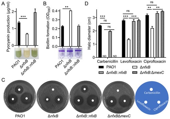 Deletion of nfxB leads to antibiotic resistance. (A,B) NfxB controls pyocyanin production and biofilm formation in P. aeruginosa. The pyocyanin production (A) or biofilm formation (B) of the wild-type PAO1, ΔnfxB mutant, and complementary strains was determined after culturing in LB medium at 37 °C for 12 h. (C,D) NfxB regulates the antibiotic resistance and susceptibility of P. aeruginosa PAO1. Cultures of the indicated wild-type PAO1, ΔnfxB mutant, complementary, and ΔnfxBΔmexC mutant strains were plated on LB solid medium. Then, 10 μL of carbenicillin (10 mg/mL), levofloxacin (0.5 ug/mL), or ciprofloxacin (0.5 mg/mL) was spotted on a paper disk. Plates were incubated at 37 °C for 12 h; photographs of the clearing-resistant zone are shown (C), and inhibition halo diameter was measured (D). (A,B,D) The data shown are the average of three independent experiments; error bars indicate the SD from three independent experiments. Statistical significance was calculated using one-way ANOVA and Dunnett’s multiple comparison test; ** p < 0.01; *** p < 0.001; n.s., not significant. (C) Similar results were obtained from three independent experiments, and the images shown are from one representative experiment.