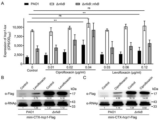 To this end, two representative fluoroquinolone antibiotics, levofloxacin and ciprofloxacin, were selected to verify the regulation mode of NfxB. After culturing PAO1 and ΔnfxB mutant strains in LB medium for 12 h with a sub-inhibitory concentration of levofloxacin or ciprofloxacin, the luminescence intensity of the hcp1-promoter-driving lux reporter in the indicated strains was quantified using a Synergy 2 plate reader. As shown in Figure 3A, in the wild-type PAO1, the expression of hcp1 was significantly upregulated at various concentrations of levofloxacin or ciprofloxacin (Figure 3A), but these changes were not observed in the ΔnfxB mutant strain (Figure 3A). To further verify the relationship between fluoroquinolone antibiotics and the H1-T6SS promoter, the Hcp1 (Hcp1-Flag) production level in the wild-type PAO1 and ΔnfxB mutant strains was determined with a Western blot using Flag antibody. Consistently with the lux luminescence reporter assay, the Hcp1 production level was approximately upregulated 2.73- or 4.59-fold by levofloxacin (Figure 3B) or ciprofloxacin (Figure 3C) in the wild-type PAO1, but not in the ΔnfxB mutant strain (Figure 3B,C). The results indicate that the expression of hcp1 in the wild-type PAO1 was repressed by NfxB, and this repression was alleviated by levofloxacin or ciprofloxacin. Taken together, our results strongly demonstrate that H1-T6SS expression is responsive to fluoroquinolone antibiotics via NfxB.