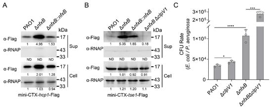 P. aeruginosa H1-T6SS secretes multiple effectors targeting bacterial and host cells, including Tse1, Tse2, and Tse3 [,]. The secretion of effectors is dependent on the integrated components of the T6SS, in which the clpV gene encodes an AAA+ family ATPase that provides energy to drive the secretory apparatus []. Our study revealed that the expression of H1-T6SS is responsive to fluoroquinolone antibiotics via the transcriptional regulator NfxB. To test whether the protein secretion of H1-T6SS is regulated by NfxB, mini-CTX-hcp1-Flag or mini-CTX-tse1-Flag production plasmids with Hcp1 and a representative effector, Tse1 were integrated into P. aeruginosa chromosomes, respectively. Then, the Hcp1 and Tse1 protein secretion and production were collected, and the protein levels were detected with a Western blot. The Hcp1 production and secretion were significantly upregulated in the ΔnfxB mutant strain, and the protein levels were restored to the wild-type level in the complementary strain (Figure 4A). Consistently with the regulation of the Hcp1 protein, the Tse1 production and secretion were negatively regulated by NfxB (Figure 4B).