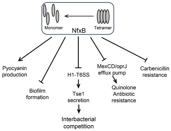 NfxB regulates pathways in P. aeruginosa. (i) NfxB positively regulates pyocyanin production by inhibiting the quorum sensing (QS) response via HHQ extrusion with the multidrug resistance efflux pump MexCD-OprJ [,]. (ii) Biofilm formation is negatively controlled by NfxB via an unknown pathway []. (iii) NfxB negatively regulates H1-T6SS expression and Tse1 secretion for interbacterial competition. (iv) NfxB negatively regulates quinolone antibiotic resistance via the MexCD/OprJ efflux pump []. (v) Carbenicillin resistance is negatively regulated by NfxB via an unknown pathway.
