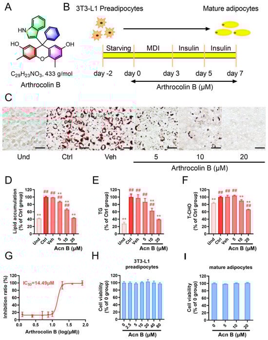 Arthrocolin B inhibits 3T3-L1 preadipocytes differentiation into mature adipocytes. (A) The chemical structure of arthrocolin B. (B) Schematic of the protocol for inducing 3T3-L1 preadipocytes to differentiate into mature adipocytes. Arthrocolin B was applied to 3T3-L1 preadipocytes for 7 days at concentrations ranging from 5 to 20 μM. Cells were harvested on day 7 for assessment of intracellular lipid levels. (C) Representative images of 3T3-L1 cells treated with various concentrations of arthrocolin B for 7 days and stained with Oil Red O. Scale bar = 50 μm. (D) Quantification of intracellular lipids by assessing Oil Red O staining intensity in the cells shown in panel C. (E) Normalized quantification of intracellular triglyceride (TG) content in the cells from panel C using a specific kit-based assay. (F) Intracellular total cholesterol (T-CHO) levels in the cells shown in panel C were determined using a specialized kit-based assay. (G) The IC50 value of arthrocolin B in inhibiting lipid accumulation. (H) 3T3-L1 preadipocytes were treated with arthrocolin B at concentrations ranging from 0 to 80 μM for 24 h, and their cell viability was evaluated using a Cell Counting Kit-8 (CCK-8) assay. (I) Cell viability of mature adipocytes treated with different doses of arthrocolin B during the entire differentiation stage (7 days) was assessed using a Cell Counting Kit-8 (CCK-8) assay. All values represent the mean ± SD (n ≥ 3) from three independent experiments. Significance is indicated as ## p < 0.01 versus the Und group; ** p < 0.01 versus the Veh group. Und, undifferentiated preadipocytes; Ctrl, normally differentiated preadipocytes; Veh, normally differentiated preadipocytes treated with dimethyl sulfoxide (DMSO); Acn B, arthrocolin B; MDI, methylxanthine, dexamethasone, and insulin.