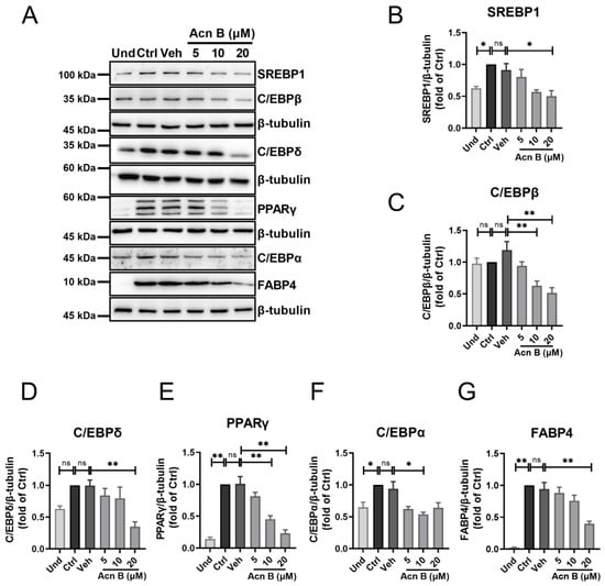 Arthrocolin B suppresses the key signaling pathway in adipocyte differentiation. (A) 3T3-L1 preadipocytes were treated with various doses of arthrocolin B for 7 days (the entire differentiation period). Cell lysates were then collected, and the expression levels of proteins SREBP1, C/EBPβ, C/EBPδ, PPARγ, C/EBPα, and FABP4 were analyzed by Western blotting. (B–G) Quantification of the bands from panel A is shown as relative protein expression levels, normalized to β-tubulin as an internal reference. Data represent the mean ± SEM from three independent experiments. Significance is presented as * p < 0.05, ** p < 0.01 between the indicated groups. ns: no significance. Und, undifferentiated preadipocytes; Ctrl, normally differentiated preadipocytes; Veh, normally differentiated preadipocytes treated with dimethyl sulfoxide (DMSO); Acn B, arthrocolin B.