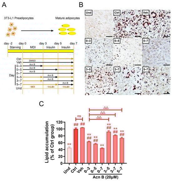 Arthrocolin B inhibits the early stage of adipocyte differentiation. (A) Schematic diagram showing the administration of arthrocolin B to 3T3-L1 cells at various stages of adipocyte differentiation. (B) Lipid droplet accumulation in 3T3-L1 preadipocytes treated with arthrocolin B at different stages, as shown in panel A, was assessed using Oil Red O staining. Scale bar = 50 μm. (C) Normalized quantification of lipid droplet accumulation in cells from panel B. Data are presented as the mean ± SEM (n ≥ 3) from three independent experiments. Significance is presented as ## p < 0.01 versus the Und group; ** p < 0.01 versus the Veh group; △△ p < 0.01 between the indicated groups. ns: no significance. Und, undifferentiated preadipocytes; Ctrl, normally differentiated preadipocytes; Veh, normally differentiated preadipocytes treated with dimethyl sulfoxide (DMSO); Acn B, arthrocolin B; MDI, methylxanthine, dexamethasone, and insulin.