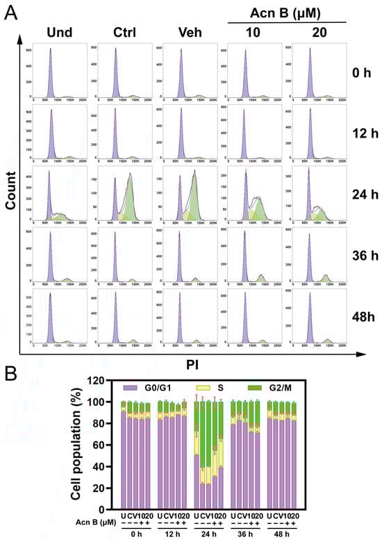 Arthrocolin B blocks cell cycle progression during MCE of adipogenesis. (A) Flow cytometry analysis of cells treated with 10 μM or 20 μM arthrocolin B for 0–48 h in the presence of differentiation agents. The colors light purple, yellow, and green in panel A indicate the proportions of cells in G0/G1, S, and G2/M phases, respectively. (B) Quantitative results of flow cytometry analysis from panel A. Values represent the percentages of cells in G0/G1, S, and G2/M phases. A total of 10,000 events were counted. Data are shown as the mean ± SEM (n ≥ 3) from three independent experiments. Und/U, undifferentiated preadipocytes; Ctrl/C, normally differentiated preadipocytes; Veh/V, normally differentiated preadipocytes treated with dimethyl sulfoxide (DMSO); Acn B, arthrocolin B.