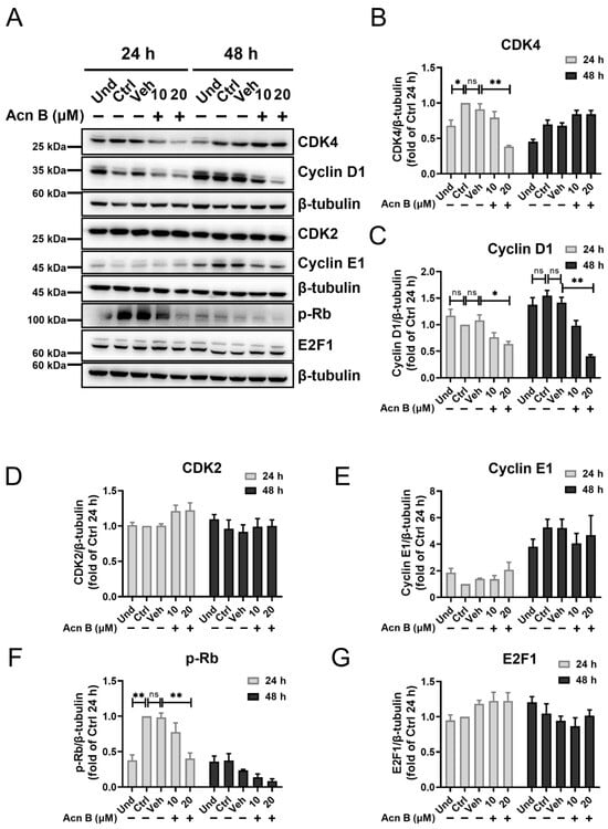 Arthrocolin B reduces the expression of key regulators associated with the G0/G1 phase. (A) 3T3-L1 preadipocytes were differentiated with MDI for 24 h or 48 h, and concurrently treated with 10 μM or 20 μM arthrocolin B. After that, cell lysates were collected, and the protein levels of CDK4, Cyclin D1, CDK2, Cyclin E1, p-Rb, and E2F1 were determined by Western blotting. (B–G) The intensity of the bands in panel A was quantified to determine the relative protein expression levels, with β-tubulin as an internal control. Data are shown as the mean ± SEM from three independent experiments. Significance is presented as * p < 0.05, ** p < 0.01 between the indicated groups. ns: no significance. Und, undifferentiated preadipocytes; Ctrl, normally differentiated preadipocytes; Veh, normally differentiated preadipocytes treated with dimethyl sulfoxide (DMSO); Acn B, arthrocolin B.