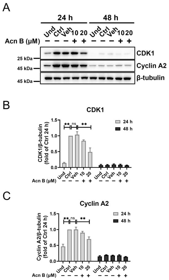 Arthrocolin B restrains the expression of key regulators associated with the S and G2/M phases. (A) 3T3-L1 preadipocytes were differentiated with MDI for 24 h or 48 h and concurrently treated with 10 μM or 20 μM arthrocolin B. After that, cell lysates were collected, and the protein levels of CDK1 and Cyclin A2 were analyzed by Western blotting. (B,C) The intensity of the bands in panel A was quantified to determine the relative protein expression levels, with β-tubulin as an internal control. Data are shown as the mean ± SEM from three independent experiments. Significance is presented as ** p < 0.01 between the indicated groups. ns: no significance. Und, undifferentiated preadipocytes; Ctrl, normally differentiated preadipocytes; Veh, normally differentiated preadipocytes treated with dimethyl sulfoxide (DMSO); Acn B, arthrocolin B.