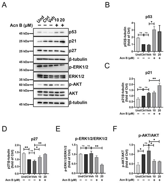 Arthrocolin B delays cell cycle progression during MCE of adipogenesis by regulating the p53, ERK, and AKT pathways. (A) 3T3-L1 preadipocytes were differentiated with MDI for 24 h and concurrently treated with 10 μM or 20 μM arthrocolin B. Subsequently, cell lysates were collected, and the protein levels of p53, p21, p27, p-ERK1/2, ERK1/2, p-AKT, and AKT were determined by Western blotting. (B–F) The intensity of the bands in panel A was quantified to determine the relative protein expression levels, with β-tubulin as an internal control. Data are shown as the mean ± SEM from three independent experiments. Significance is presented as * p < 0.05, ** p < 0.01 between the indicated groups. ns: no significance. Und, undifferentiated preadipocytes; Ctrl, normally differentiated preadipocytes; Veh, normally differentiated preadipocytes treated with dimethyl sulfoxide (DMSO); Acn B, arthrocolin B.