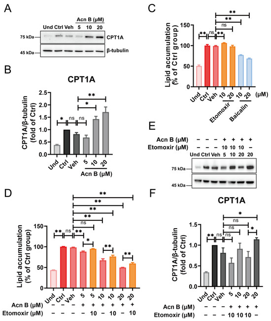 Arthrocolin B inhibits adipogenesis by promoting CPT1A expression. (A) 3T3-L1 preadipocytes were treated with various concentrations of arthrocolin B for 7 days (the entire differentiation period). Then, cell lysates were collected, and the protein levels of CPT1A were determined by Western blotting. (B) The intensity of the bands in panel A was quantified to determine the relative protein expression levels, with β-tubulin as an internal control. (C,D) 3T3-L1 preadipocytes were treated for 7 days with either 10 μM or 20 μM Etomoxir, baicalin, or various concentrations of arthrocolin B (with or without 10 μM Etomoxir). After treatment, intracellular lipid levels were assessed by Oil Red O staining and absorbance measurement at 510 nm. (E) 3T3-L1 preadipocytes were treated with various concentrations of arthrocolin B (with or without 10 μM Etomoxir) for 7 days. Then, cell lysates were collected, and CPT1A protein levels were determined by Western blotting. (F) The intensity of the bands in panel E was quantified to determine the relative protein expression levels, with β-tubulin as an internal control. Data are shown as the mean ± SD from three independent experiments. Significance is presented as * p < 0.05, ** p < 0.01 between the indicated groups. ns: no significance. Und, undifferentiated preadipocytes; Ctrl, normally differentiated preadipocytes; Veh, normally differentiated preadipocytes treated with dimethyl sulfoxide (DMSO); Acn B, arthrocolin B.