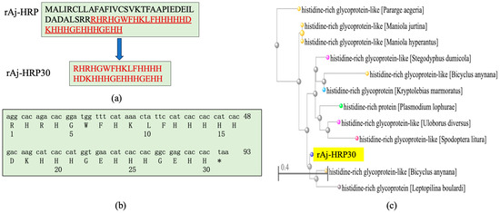 After analyzing the rAj-HRP sequence, we selected the amino acid sequence from positions 38 to 67 as the core sequence of rAj-HRP30 (Figure 1a). After the gene was optimized for better compatibility with the E. coli expression system, the cDNA sequence was finalized and artificially synthesized. Due to the fact that protein drugs are not allowed to carry purification tags, a stop codon was added to the 3′ end of the rAj-HRP30 cDNA. The synthetic cDNA sequence of rAj-HRP30 and its deduced amino acid sequence are shown in Figure 1b. Sequence alignment of rAj-HRP30 revealed that rAj-HRP30 shares over 68% sequence identity with histidine-rich glycoprotein-like (HRG-like) proteins from species such as Spodoptera litura, Plasmodium lophurae, Bicyclus anynana, and Pararge aegeria (Figure 1c).