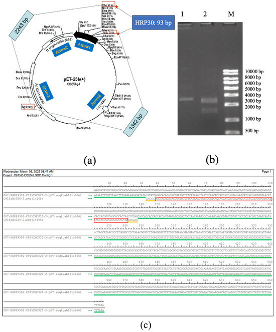 (a) Schematic representation of the pET23b vector containing the rAj-HRP30 gene and the restriction sites identified through double digestion. Arrow 1 represents the insertion direction of the multiple cloning sites (MCS); Arrow 2 represents the copy direction of f1 origin; Arrow 3 represents the transcription direction of the resistance gene Amp; Arrow 4 represents the copy direction of ori. (b) Restriction enzyme digestion analysis of the pET23b-HRP30 plasmid: approximately 200–1000 ng of plasmid DNA was digested at 37 °C for 30–60 min and analyzed on a 1% agarose gel. Lane M: DNA size marker (KB ladder); Lane 1: undigested pET23b-HRP30 recombinant plasmid; Lane 2: pET23b-HRP30 recombinant plasmid digested with Bgl I and Xho I (This data is from Kingsley Biotechnology (Nanjing, China)). (c) Sequencing results of the pET23b-HRP30 recombinant plasmid: The green marker represents the DNA sequence of pET23b plasmid. The yellow markers represent the Nde I and Xho I restriction enzyme sites. The red marker represents the cDNA sequence of HRP30.